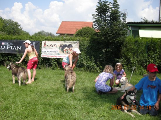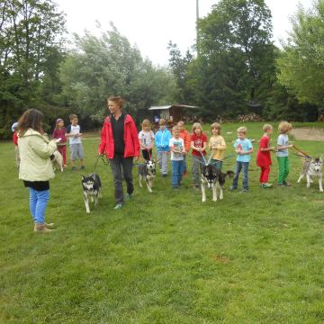 Gerade in der Rennpause von April bis Oktober biete ich Kindern und Jugendlichen die Gelegenheit, mit meinem sozialisierten Rudel angstfreien Kontakt und den richtigen Umgang mit Hunden zu üben.
